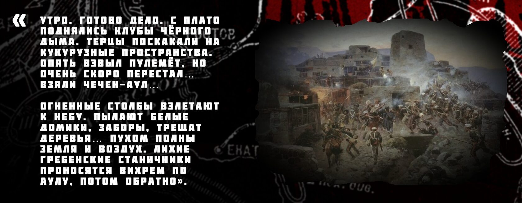 Весной 1919-го года Антон Деникин отправил на усмирение Чечни небольшие силы во главе с генералом Даниилом Драценко, который железом и кровью прекратил исламистское восстание в Чечне за 18 дней. Однако теперь, осенью 1919-го, в период неудач «белых» исламисты вновь взялись за оружие, встав на пути русских добровольцев, теснимых большевиками. В боях в Чечне участвовал и Михаил Булгаков.